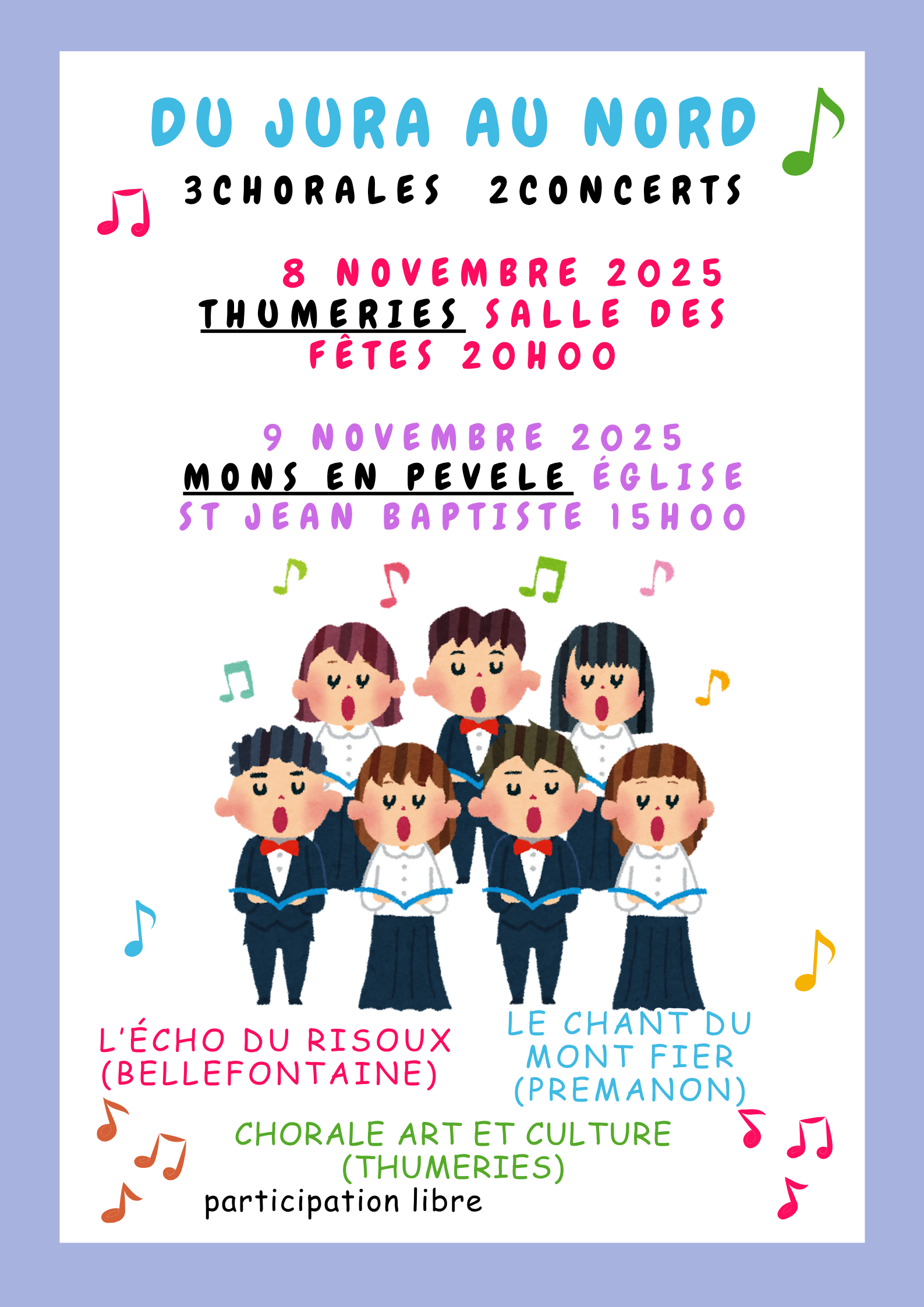 Personnes à mobilité réduite Enfants en poussetteAprès être allée chanter dans le Jura au printemps dernier, la chorale de Thumeries accueille à son tour deux chorales du Jura.